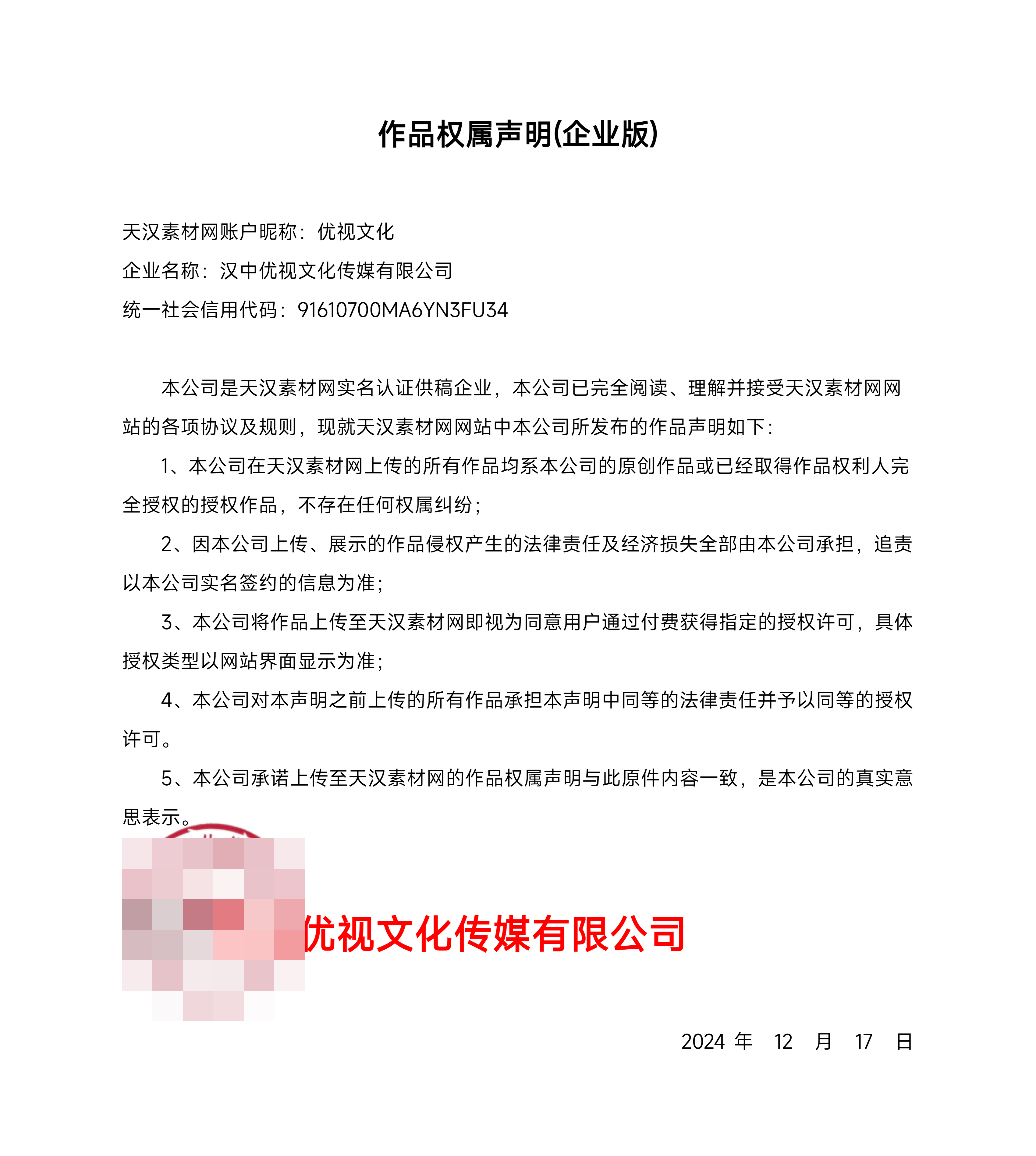 天汉素材网是素材交易平台,网站所有作品(含预览图)均为供稿人拥有版权并自行上传销售,受著作权法保护,未经权利人许可,请勿使用,否则将根据我国著作权的相关法律承担赔偿责任。